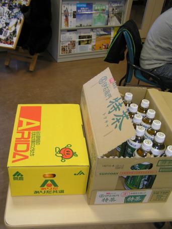 みかん一箱と人数分の「体脂肪を減らす特茶」です。
